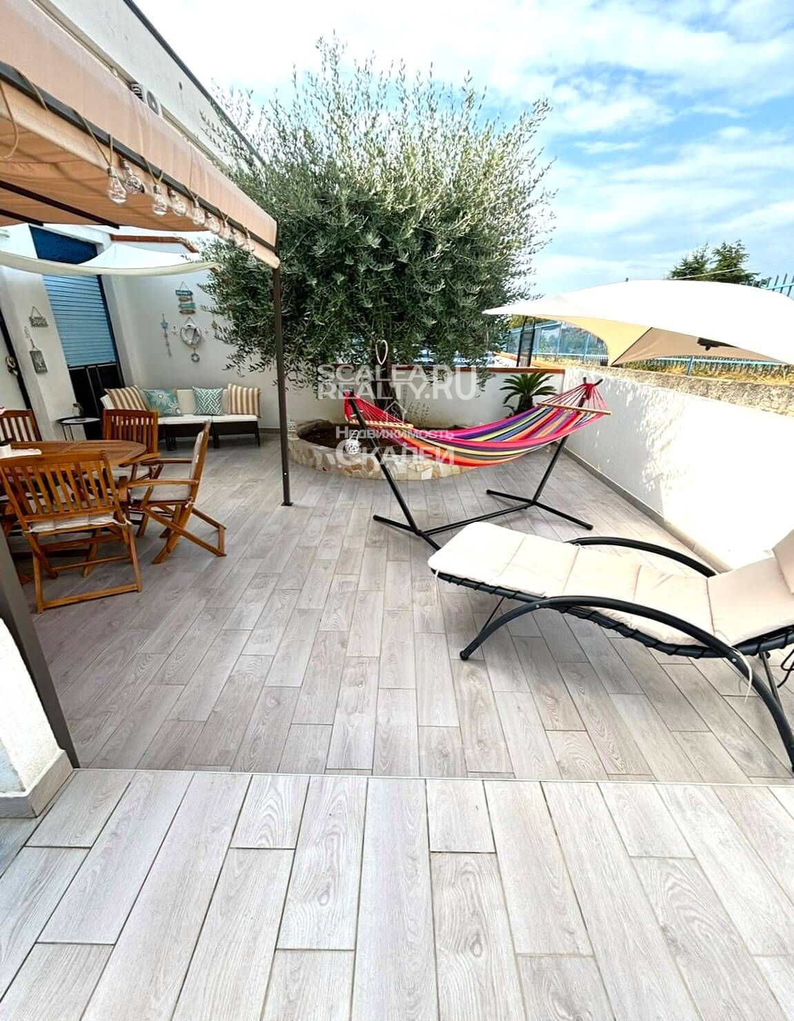 В городе Скалея по улице Faro в жилом комплексе "Il Faro" предлагаем таунхаус на 1 этаже с отдельным входом. Квартира на первом этаже имеет большой внешний двор площадью около 40 кв.метров. (одна часть уложена плиткой, другая -с зеленью).