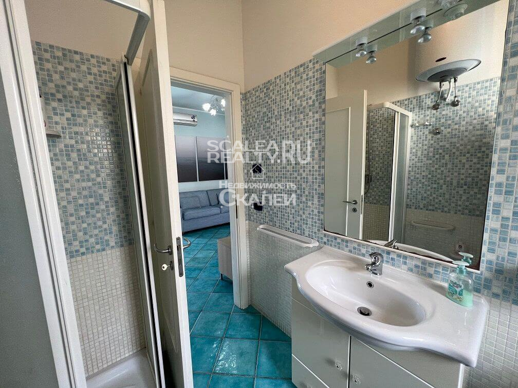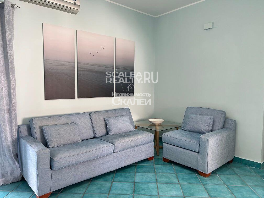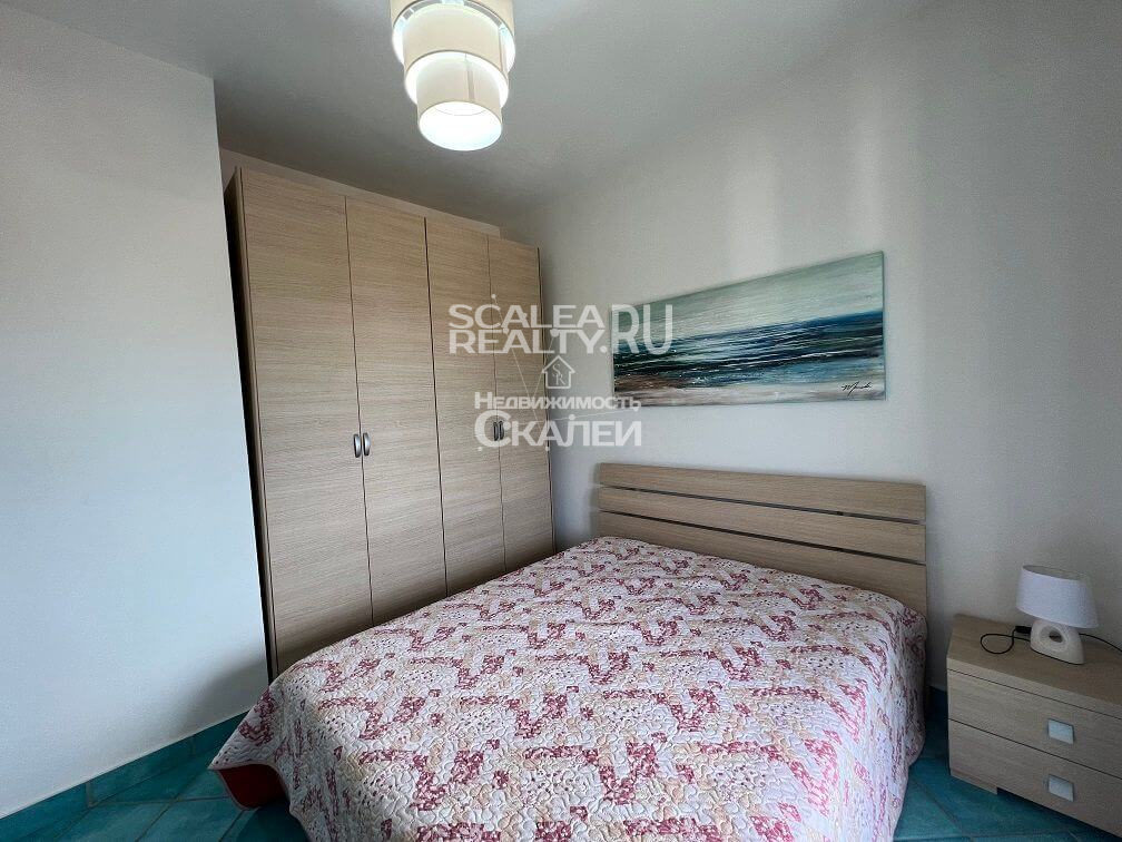 Следующая планировка: при входе большая отдельная гостиная с выходом на террассу, просторная спальня, детская, просторный санузел с окном. С террассы открывается панорамный вид на море и город Скалея.