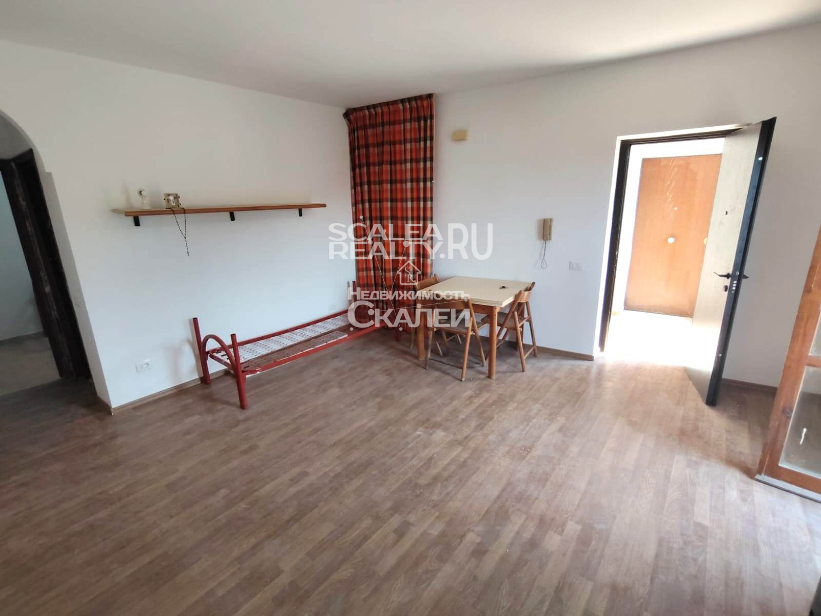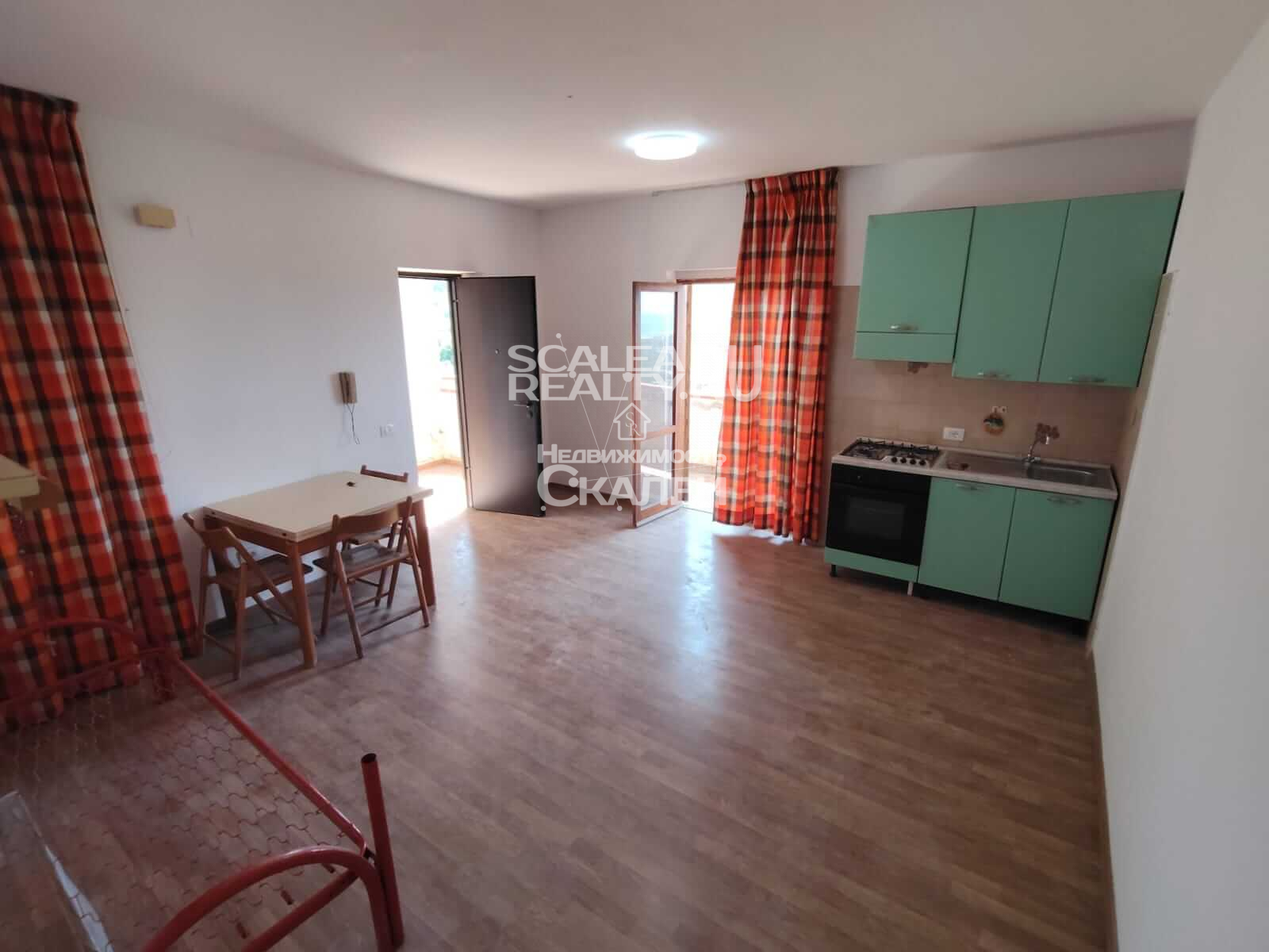 Двухкомнатная квартира имеет следующую планировку: просторная гостиная с выходом панорамный балкон, коридор, небольшая спальня, длинный санузел с окном. Прямой вид на Историческую часть города Скалеи и море. Апартамент находится в хорошем состоянии. Частично отремонтированный аппартамент. Дистанция до центра города и до моря около 10 минут пешком.