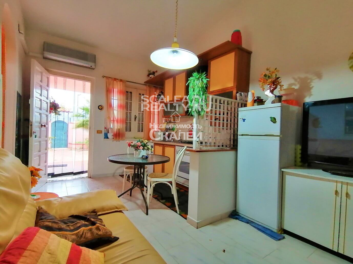 Домик расположен при въезде и имеет парковочное место у дома. Шикарный зеленый садик 150 кв.метров, есть душ и стоит деревянный домик, в котором есть уличный санузел. Следующая планировка: при входе терраса, выложенная плиткой, гостиная с кухней 255, огороженная часть гостиной с диванеом и ТВ, ванная комната, две просторные спальни. В общем состояние дома отличное. Можно заезжать и жить.