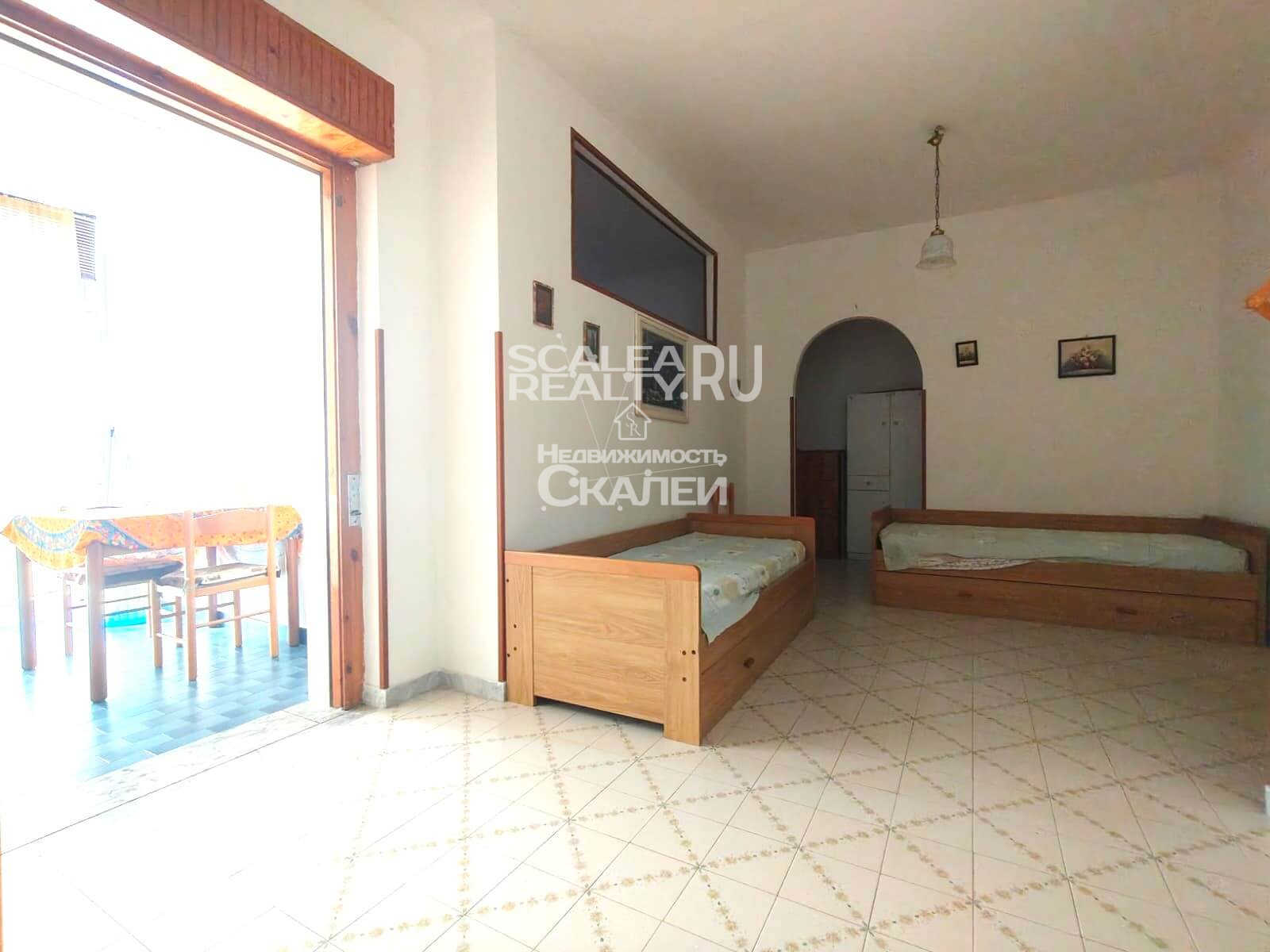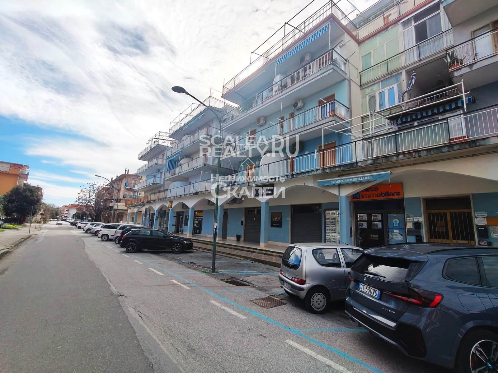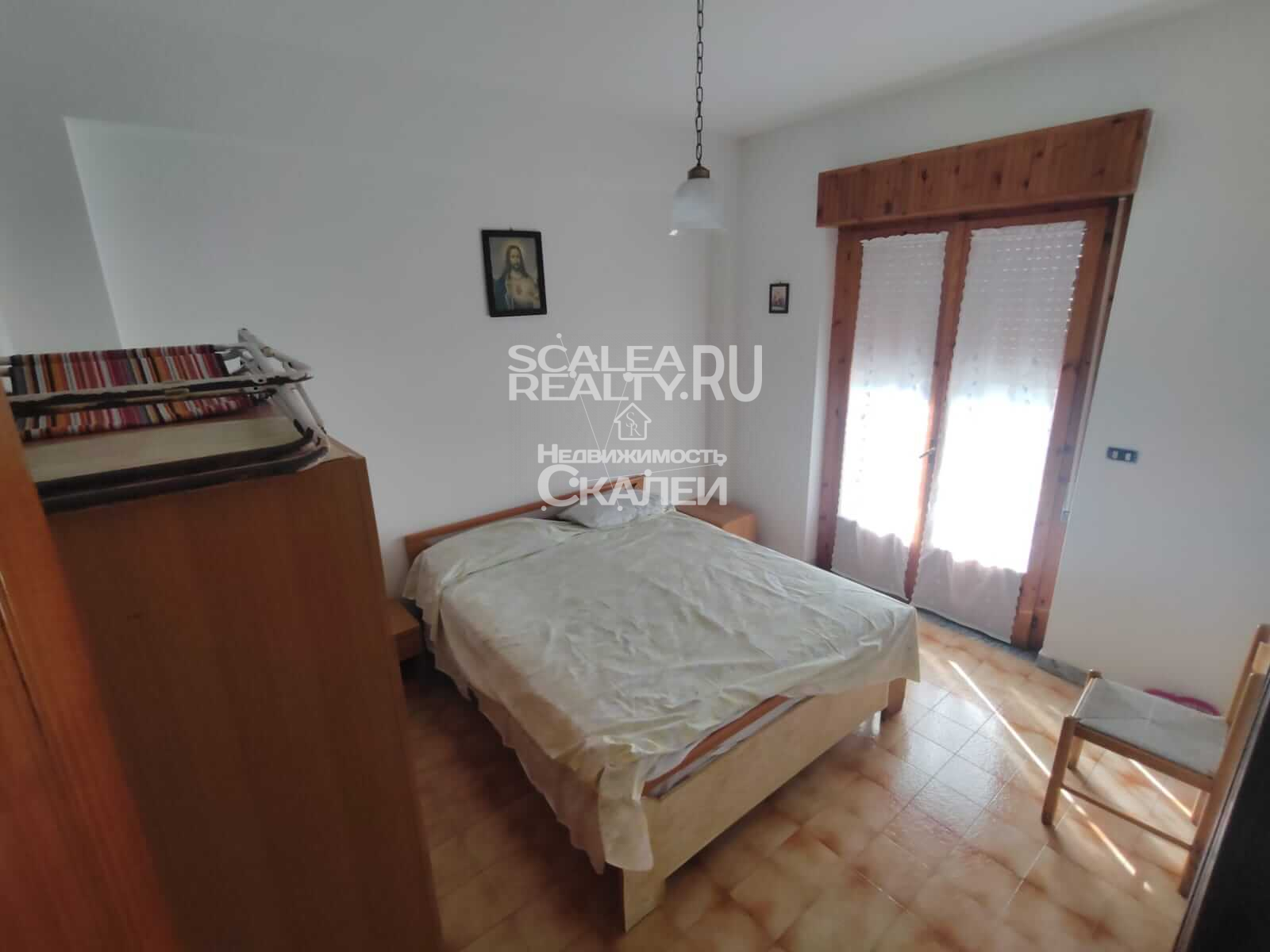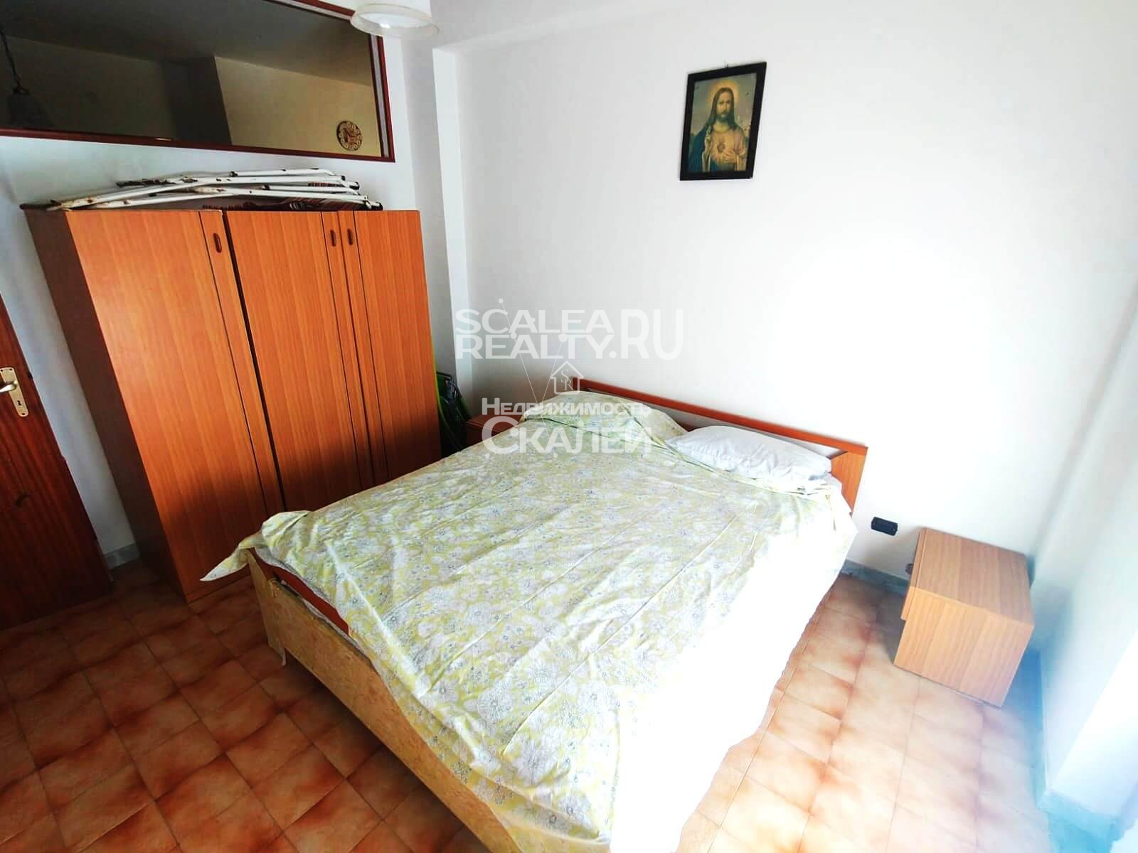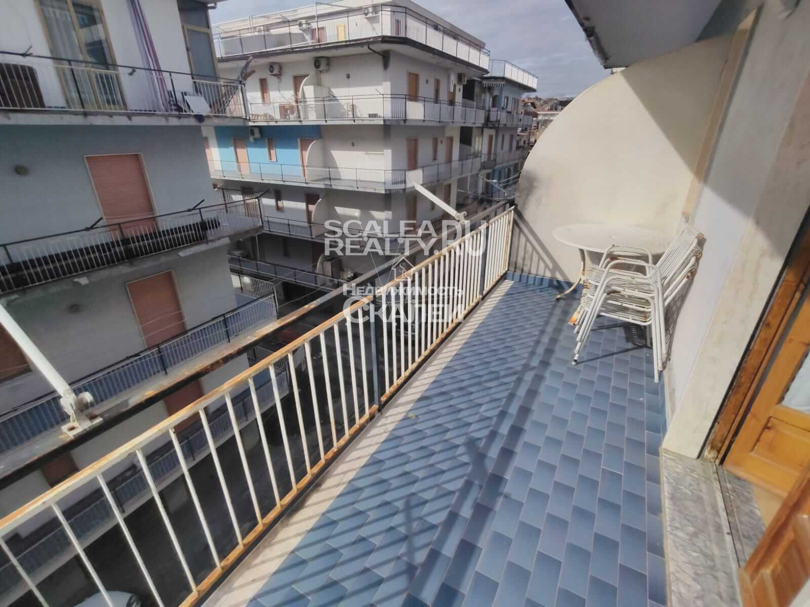 Площадь квартиры около 60 кв.метров + балкон 10 кв.м. Третий этаж дома, в котором проживают жители Скалеи. Очень просторная квартира со следующей планировкой: просторная гостиная с кухней в виде "апендицита." Есть выход на первый стекленный балкон, спальня со вторым балконом, большой санузел с окном. Очень светлая, солнечная и теплая.