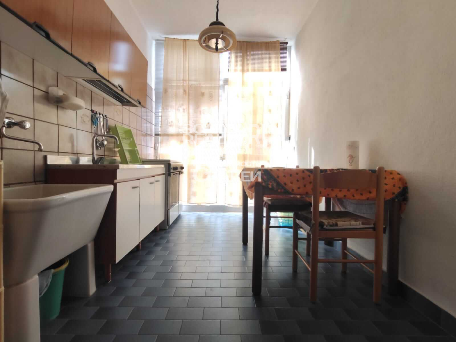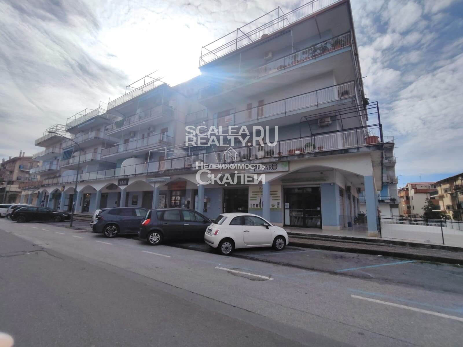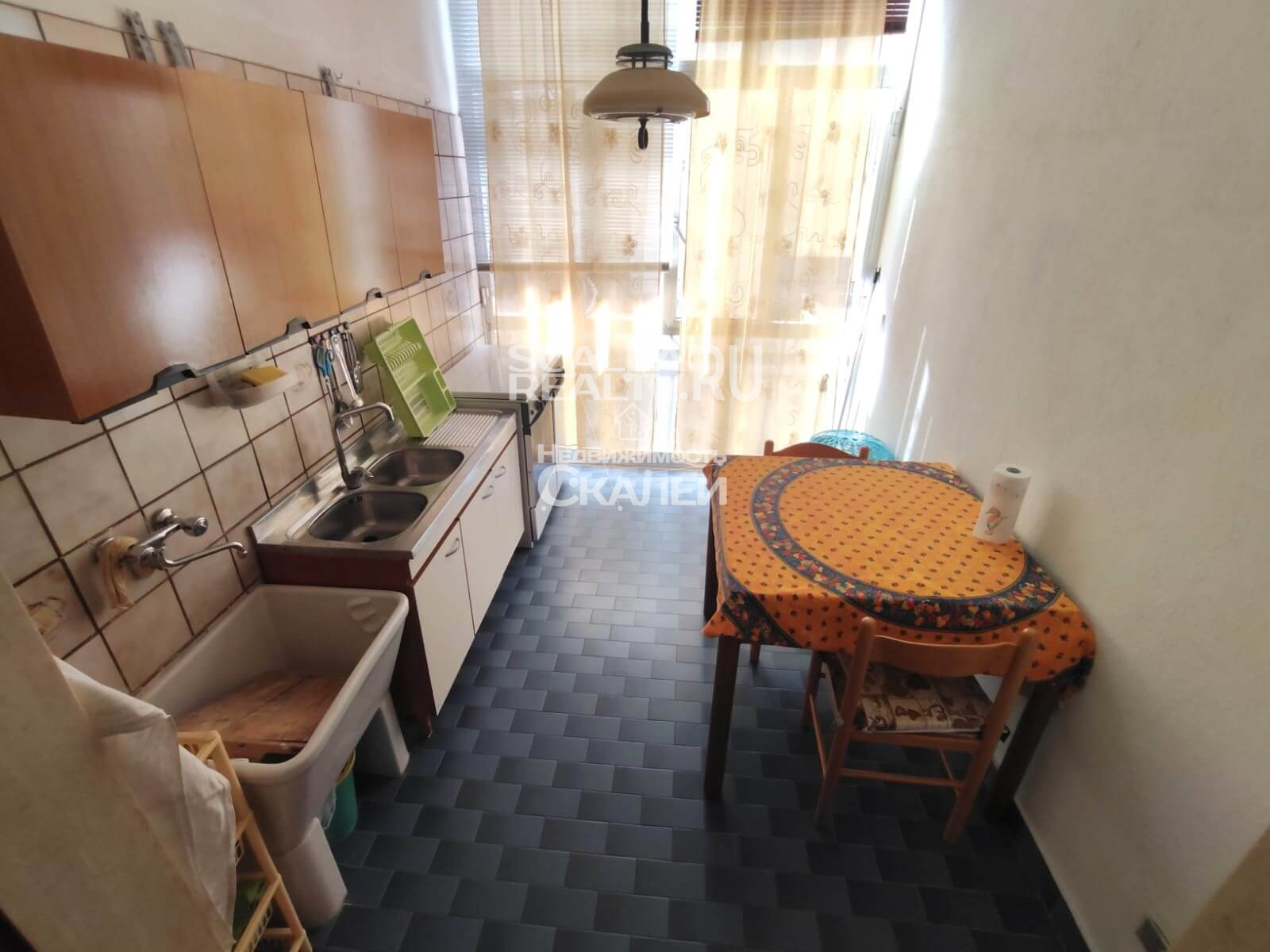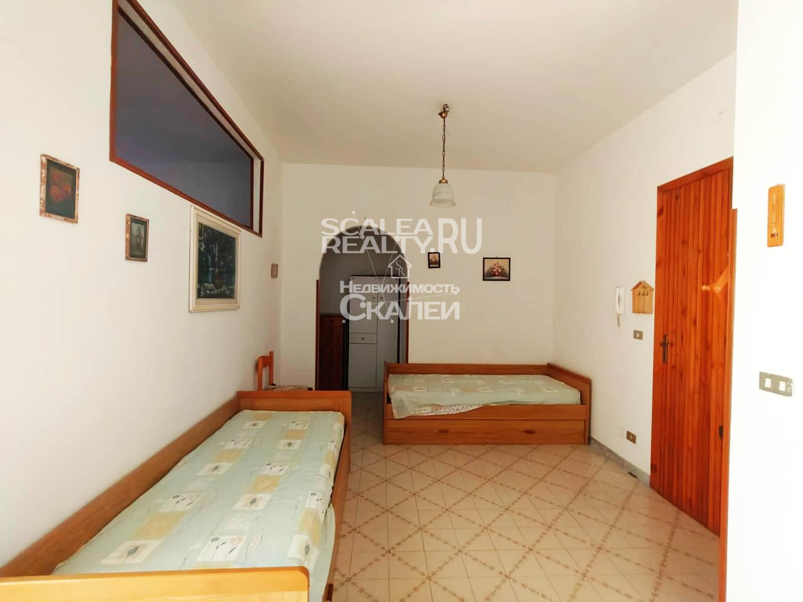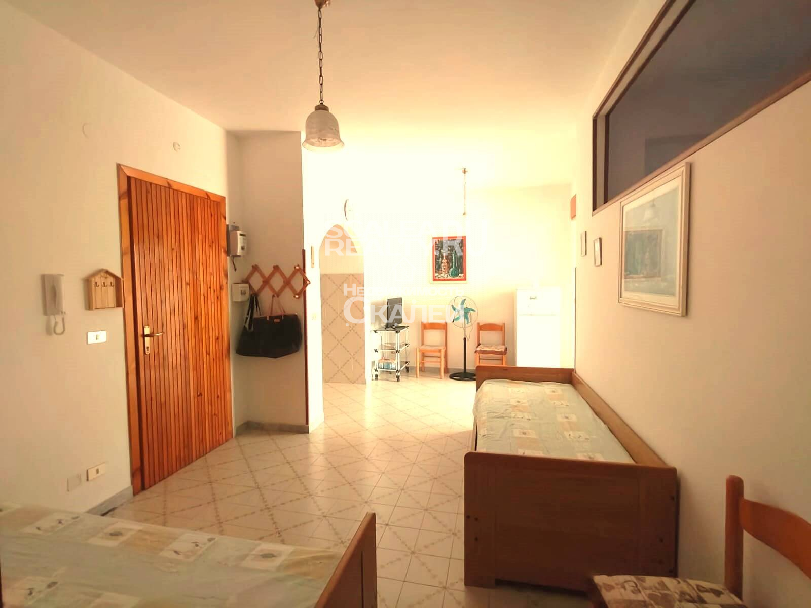 Площадь квартиры около 60 кв.метров + балкон 10 кв.м. Третий этаж дома, в котором проживают жители Скалеи. Очень просторная квартира со следующей планировкой: просторная гостиная с кухней в виде "апендицита." Есть выход на первый стекленный балкон, спальня со вторым балконом, большой санузел с окном. Очень светлая, солнечная и теплая.